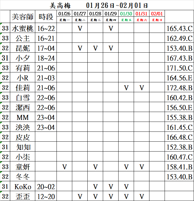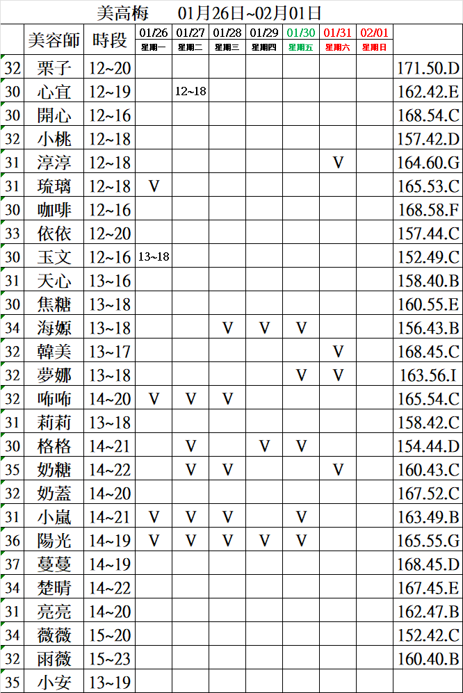 當週班表 115年度 1/26~2/01